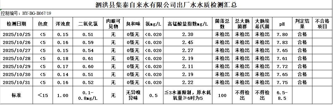 泗洪縣集泰自來水公司2025年10月份水質檢測公示