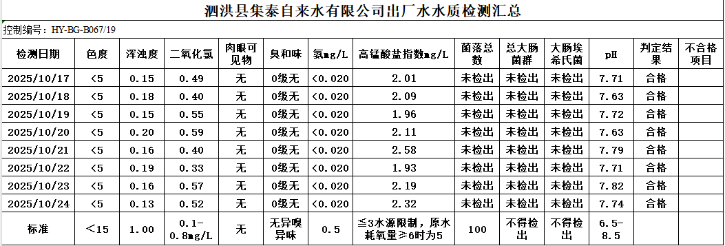 泗洪縣集泰自來水公司2025年10月份水質檢測公示