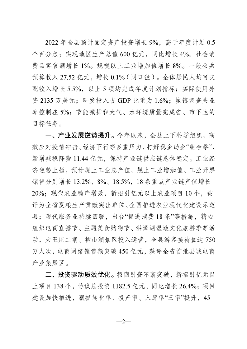 關于泗洪縣2022年國民經濟和社會發展計劃執行情況與2023年國民經濟和社會發展計劃(草案)的報告