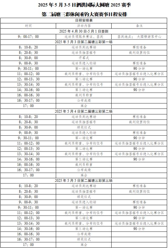 泗洪國際大圓塘“石川”杯第二屆塘三彩休閑垂釣大賽賽程表