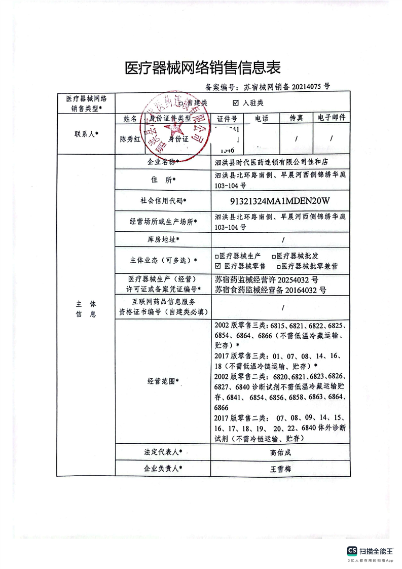 醫(yī)療器械網絡銷售備案公示(泗洪縣時代醫(yī)藥連鎖有限公司佳和店)