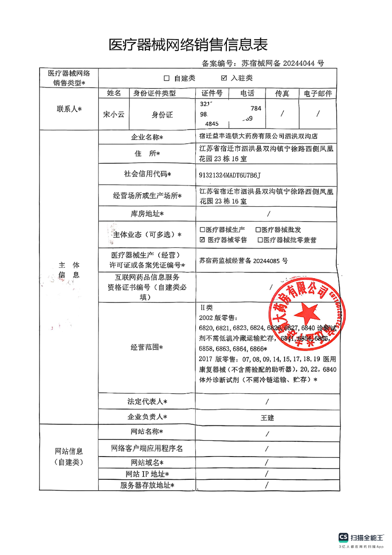醫療器械網絡銷售備案公示(宿遷益豐連鎖大藥房有限公司泗洪雙溝店)