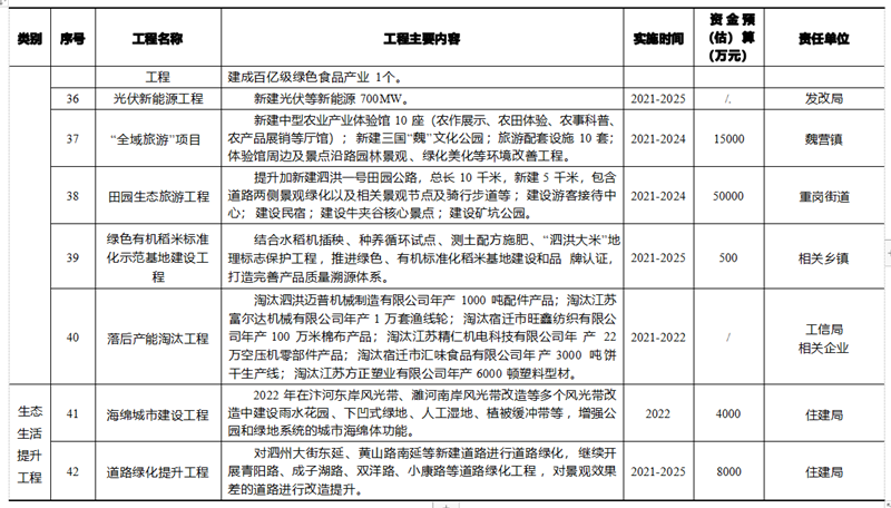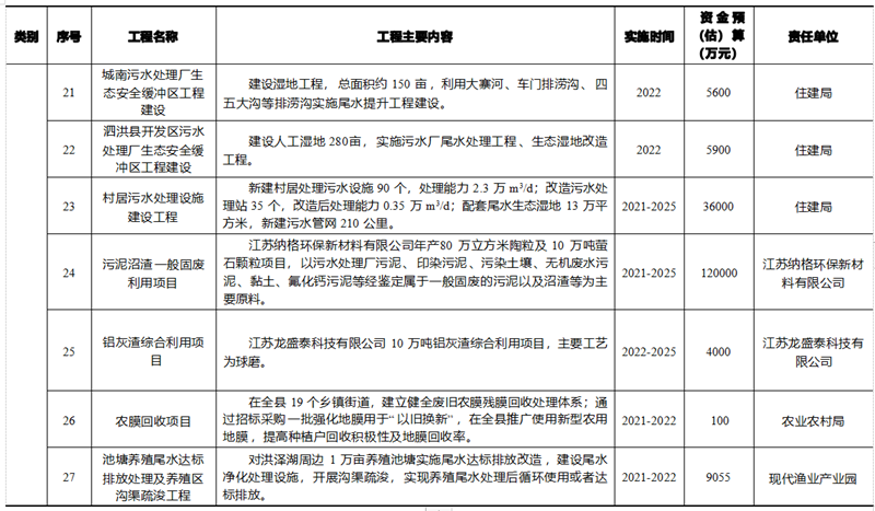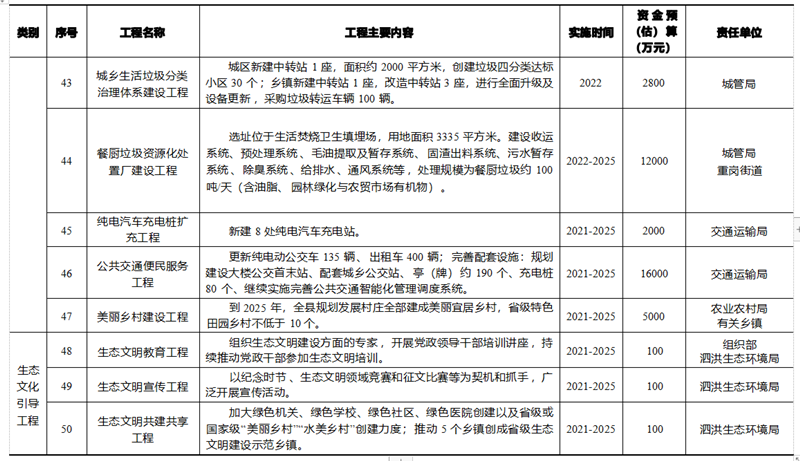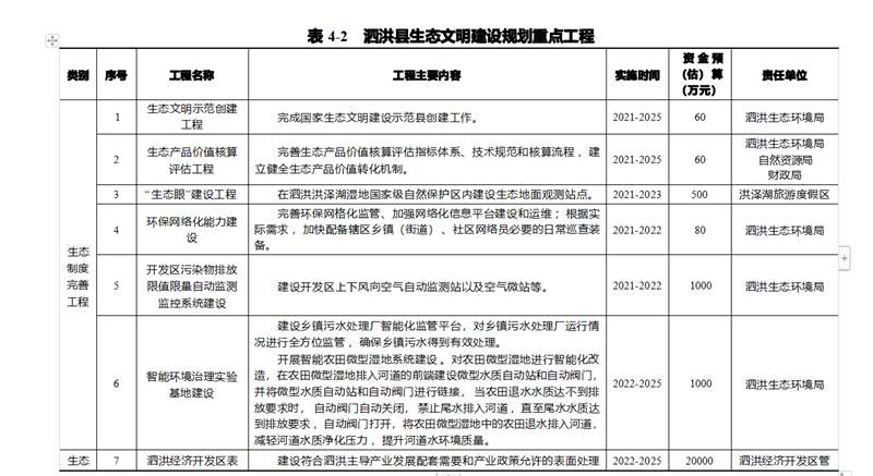基于泗洪縣生態文明建設規劃內容,統籌安排生態制度完善工程、 生態安全保障工程、生態空間優化工程、生態經濟培育工程、生態生 活提升工程、生態文化引導工程 6 大體系、50 項重點工程 ,各類項目具體數量和投資額見表 4- 1 ,工程項目明細見表 4-2。