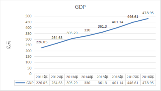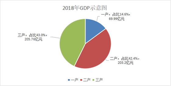 經濟總量持續增長。初步核算,2018年全縣地區生產總值478.95億元,比上年增長6.9%,比全省快0.2個百分點,比全國快0.3個百分點。其中,第一產業增加值69.99億元,增長3.2%;第二產業增加值203.20億元,增長6.2%;第三產業增加值205.76億元,增長8.8%。人均GDP53303元,按平均匯率達8055美元。